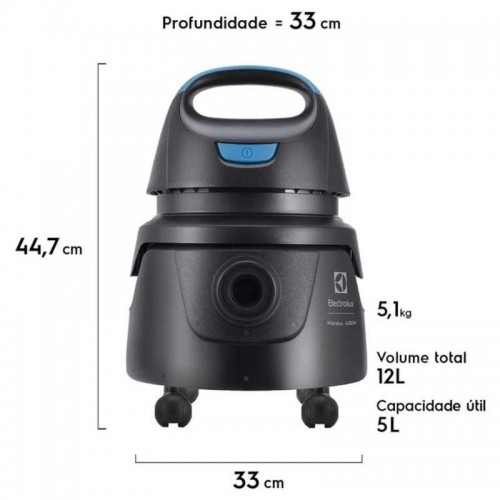 5L, capaz de aspirar pó, sujeira e água com máxima eficiência.