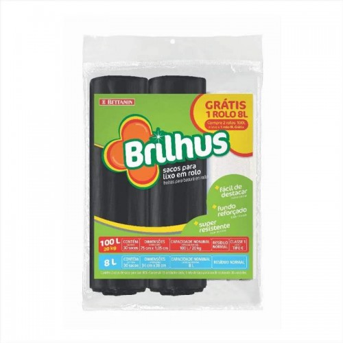 O Saco de Lixo em Rolo 8L e 100L Brilhus Bettanin é uma versão promocional que conta com 2 rolos de 100 litros e 1 rolo de 8 litros. Eles possuem picote entre as unidades, facilitando o destaque na hora do uso. Também é super resistente com fundo reforçado em formato estrela, o que distribui melhor o peso dos resíduos, dificultando o rompimento do saco. Os sacos são exclusivos para lixo e não são recomendados para conteúdos perfurantes. Não possuem sistema de fechamento e devem ser mantidos fora do alcance de crianças.
