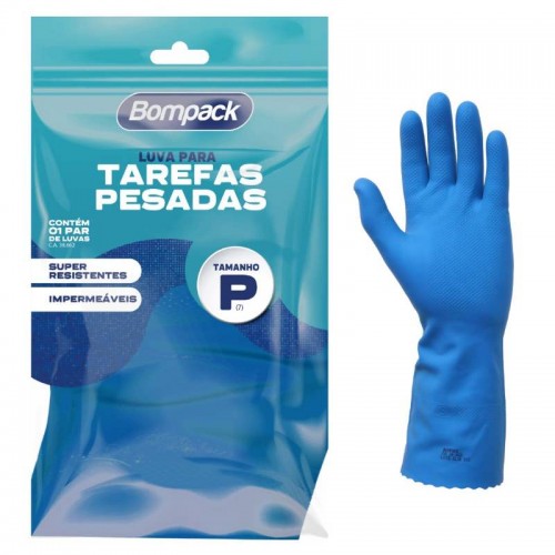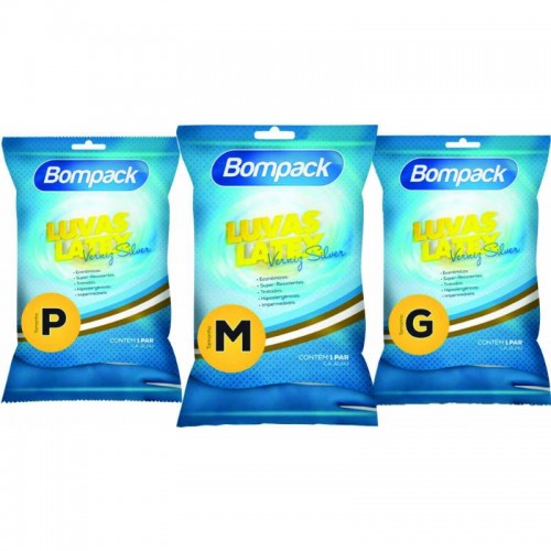 Luvas produzidas em látex e verniz silver da marca Bompack, com tamanho P, contendo 1 par por embalagem e 144 embalagens por embarque.