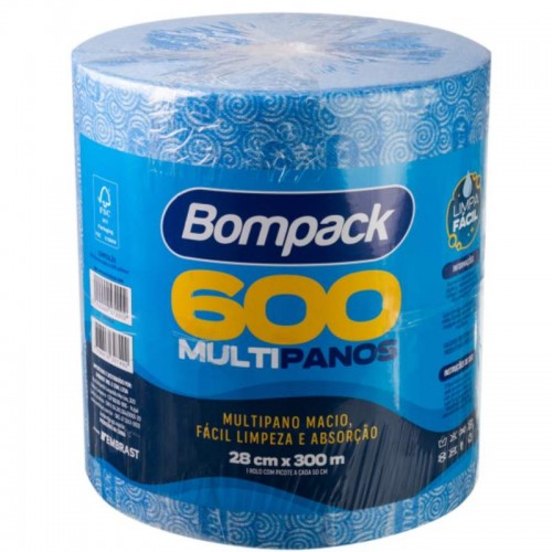 Multipanos produzidos 50% em fibra de madeira e 50% em poliéster da marca Bompack, com tamanho 28x50cm (pano) por 300m (rolo picotado) e contendo 600 panos por rolo.