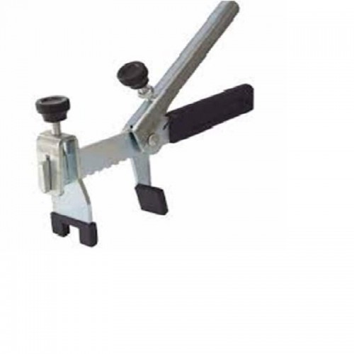 Instruções de utilização do produto – Solte o parafuso do apoio frontal e deslize a base de apoio frontal do alicate até encostar-se à cunha, que está encaixada no espaçador/nivelador e então aperte novamente o parafuso nesta posição (este ajuste varia de acordo com a espessura do revestimento). Para o ajuste final, gire o parafuso até que a base de apoio traseira do alicate encoste no outro lado da Cunha. O ajuste correto é aquele que permite a força máxima de pressão no alicate para fixar a cunha sem romper o clipe do espaçador nivelador.