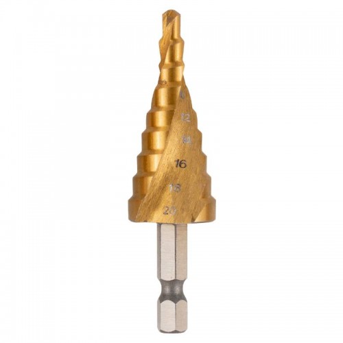 As brocas escalonadas são projetadas para perfurar furos de diferentes diâmetros em chapas e produtos de paredes finas, de aço até 4 mm, metais não ferrosos, aço inoxidável e plástico. Cada tamanho seguinte tem uma transição suave na forma de um passo, o que permite obter um furo limpo do diâmetro desejado.