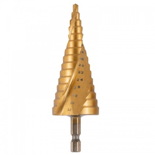 As brocas escalonadas são projetadas para perfurar furos de diferentes diâmetros em chapas e produtos de paredes finas, de aço até 4 mm, metais não ferrosos, aço inoxidável e plástico. Cada tamanho seguinte tem uma transição suave na forma de um passo, o que permite obter um furo limpo do diâmetro desejado.