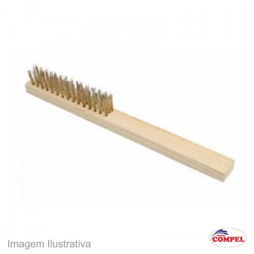 Especificações do Produto: - Base em madeira tratada. - Cerdas de aço Latonado com 3 fileiras com cabo. Indicações: - Utilizada na remoção de resíduos de paredes, rebocos estufados, produtos mofados, pinturas velhas e cal. - Indicada para o preparo e tratamento de superfícies metálicas, de madeira ou alvenaria. Características Após o uso,retirar todos os resíduos das cerdas, esfregando-a em uma superfície rústica, guardar em local arejado. - Proteger as cerdas de aço com papelão, espuma ou isopor, evitando acidentes.