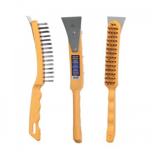Uma escova feita de aço carbono latonado. Ideal para o uso em trabalhos de limpeza e acabamento de peças, remover ferrugens, totalmente multiuso.
