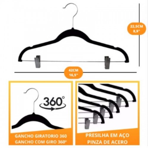 - Material: Plástico revestido com veludo flocado e gancho de metal cromado