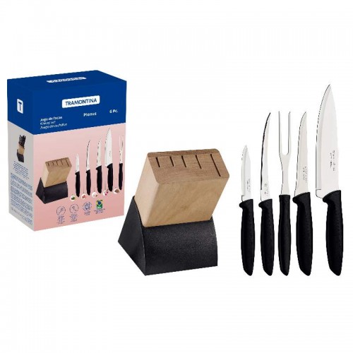 Plenus com Lâminas em Aço Inox Cabos de Polipropileno Preto e Suporte de Madeira