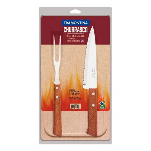 Com o jogo trinchante Tramontina Churrasco com lâminas em aço inox e cabos de madeira natural 03 peças você não irá mais passar trabalho na hora de servir aquele delicioso churrasco para seus amigos e familiares. As peças do jogo são produzidos com lâmina em aço inox, onde a faca possui maior durabilidade em seu fio de corte, devido ao tratamento térmico e o garfo garante maior resistência ao uso. Os cabos são em madeira natural com rebites de alumínio e proporcionam um manuseio muito mais seguro e confortável, pois o formato se adequa perfeitamente à palma da mão. E o jogo conta com uma tábua em madeira. Conte com a Tramontina e deixe sua vida ainda mais gostosa!