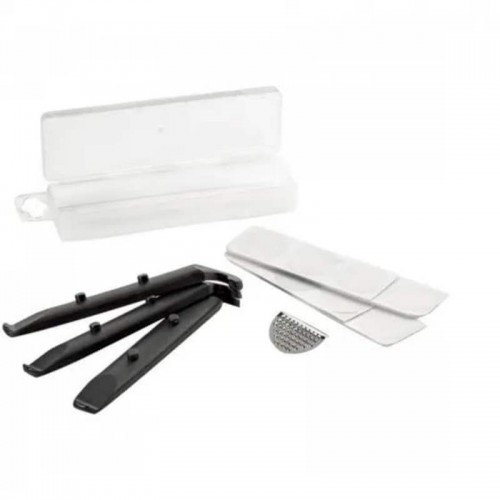 Conta com uma lixa metálica, 6 remendos auto adesivos, 3 espátulas e um estojo compacto.