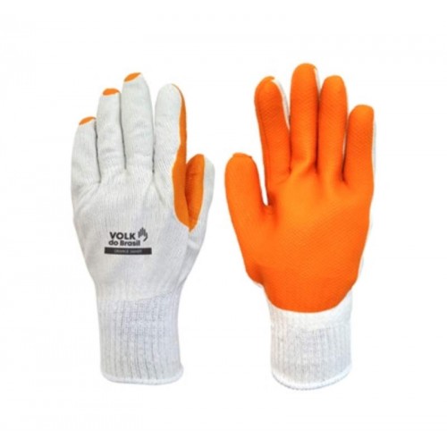 Luva de segurança confeccionada em suporte têxtil de fibras naturais e sintéticas de cor branca com aplique de látex vulcanizado alaranjado na palma e ponta dos dedos. Punho com acabamento em elastano e costura overlock.