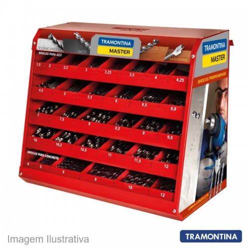 Display com Brocas C5 DIV Master da Tramontina; As brocas para aço são referência em resistência e durabilidade na perfuração de metais. Já as brocas indicadas para concreto devem ser utilizadas com furadeiras de impacto no modo martelete. E para um trabalho bem feito, você precisa das ferramentas certas que a marca tem pra oferecer.
